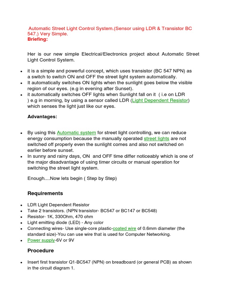Automatic Street Light Control System Bipolar Junction Transistor Light Emitting Diode